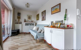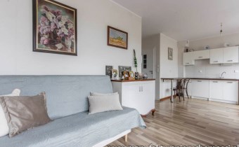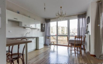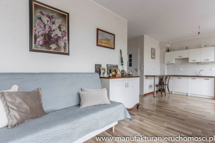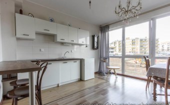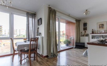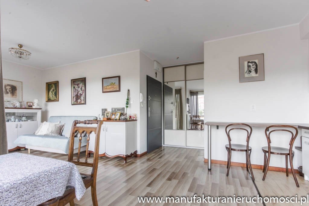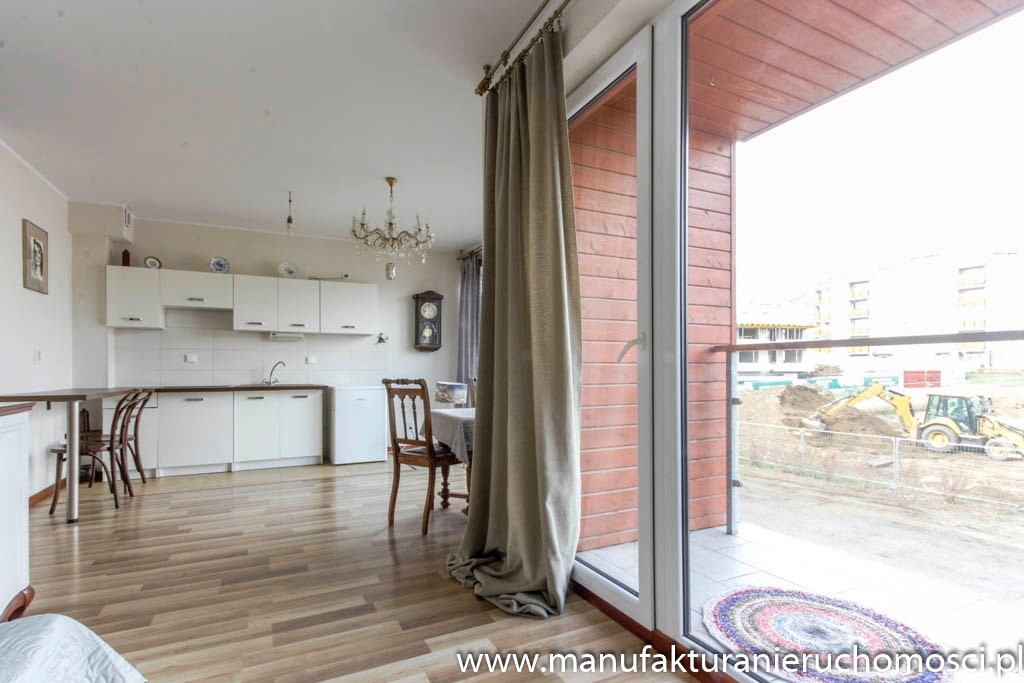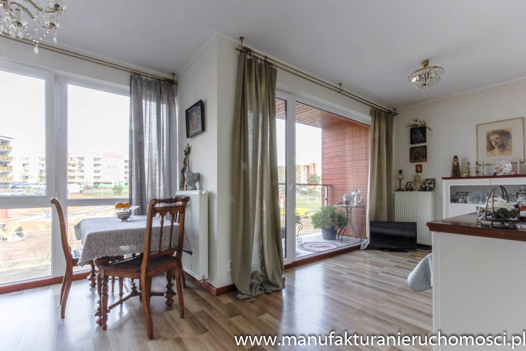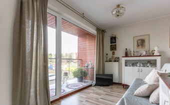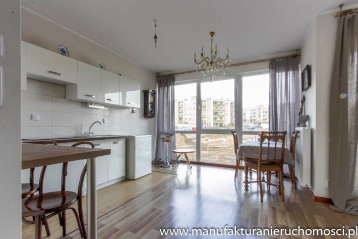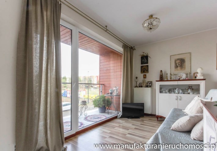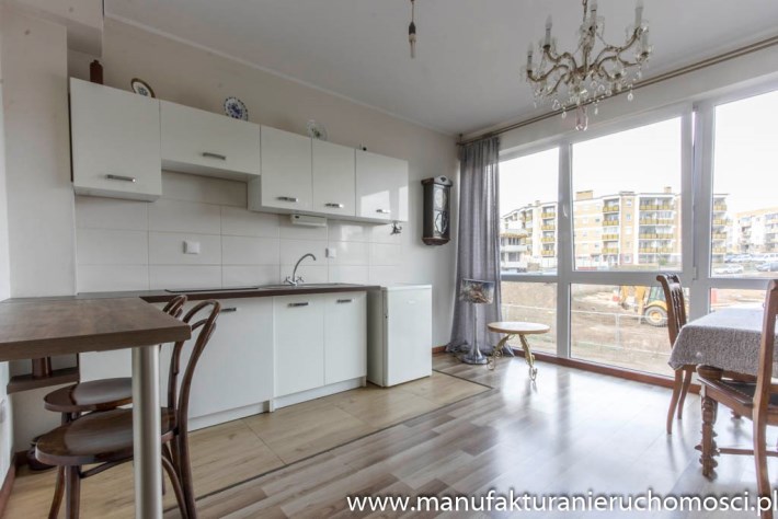 Dużym atutem nieruchomości są panoramiczne okna, dzięki którym mieszkanie jest jasne i mimo niedużego metrażu przestrzenne.