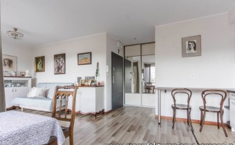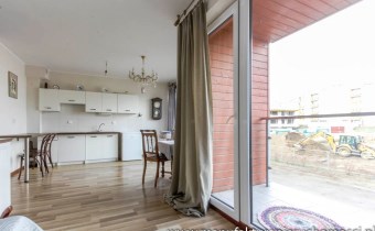 Układ mieszkania pozwala jednak na całkowite oddzielenie pomieszczeń i uzyskania tym samym oddzielnej sypialni i kompaktowego salonu z aneksem kuchennym.