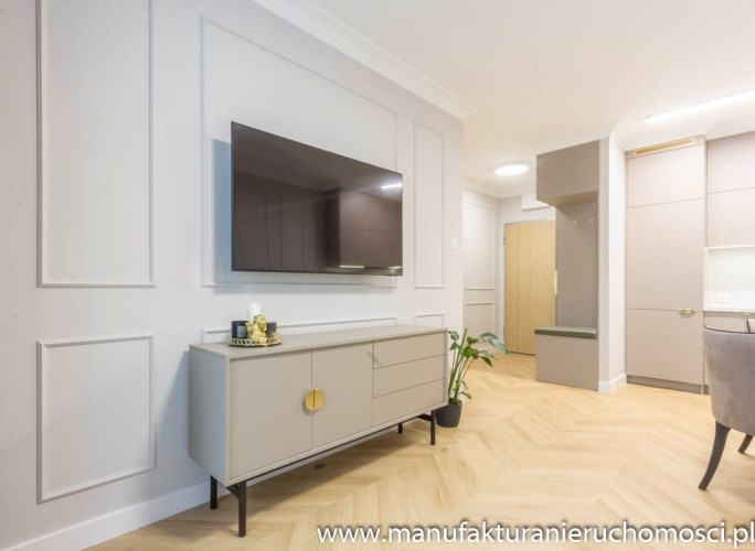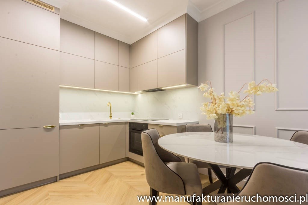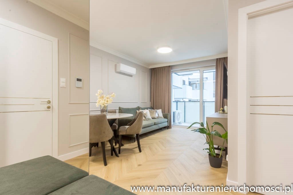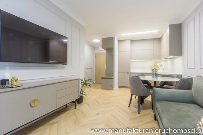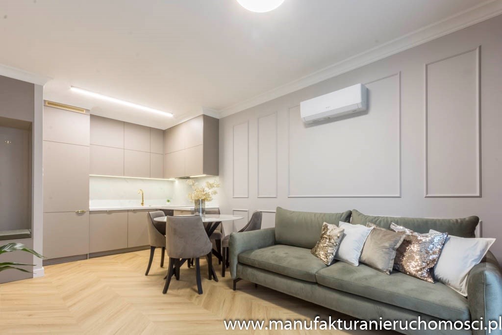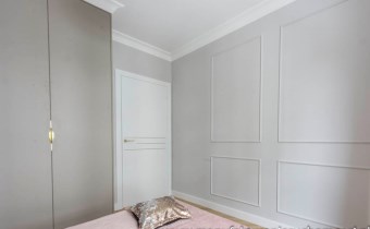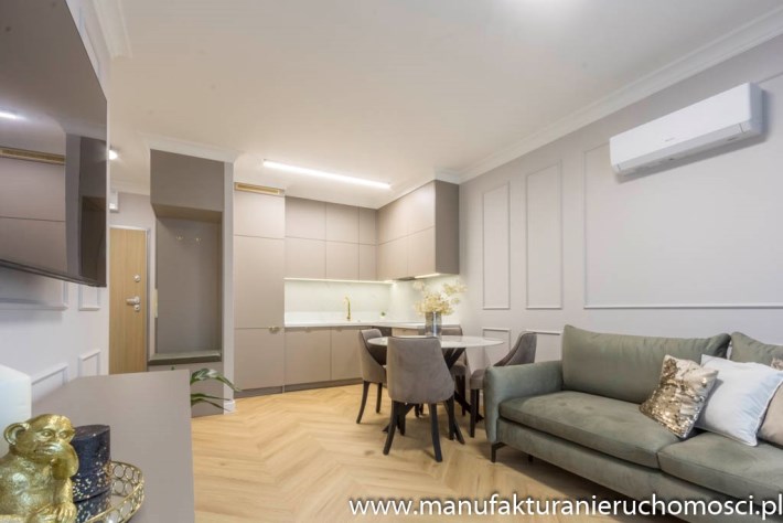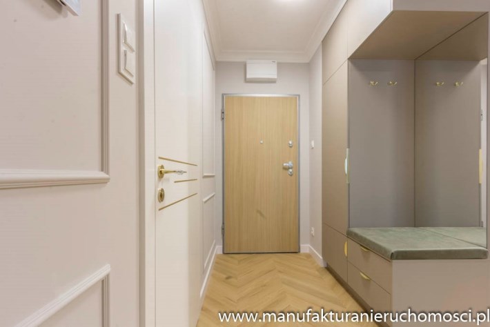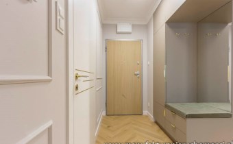Nieruchomość zdobi piękna, subtelna sztukateria, idealnie zgrana z elegancką podłogą na wzór jodły francuskiej.