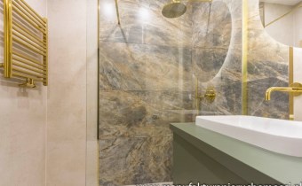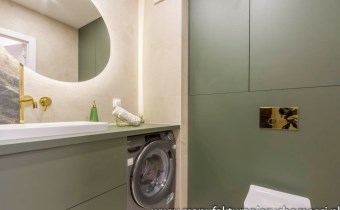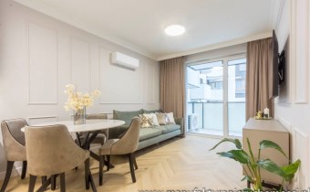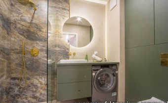 Pastelowe kolory, złote dodatki, solidne, bezprzylgowe, malowane drzwi, wszystko doprecyzowane w każdym calu tworzy spójną całość, w której miło się spędza czas.