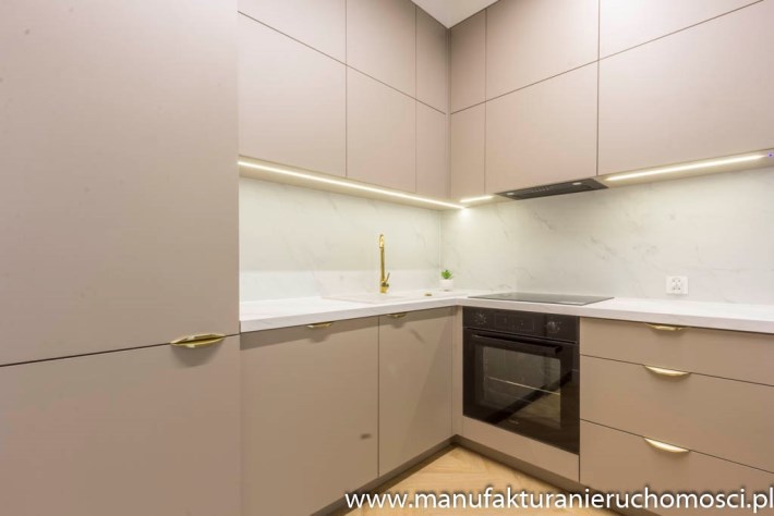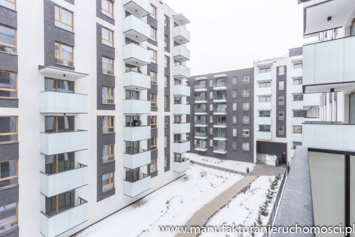 - aneks kuchenny połączony z salonem (19,52 m2) z wyjściem na balkon (3,55 m2) i widokiem na dziedziniec