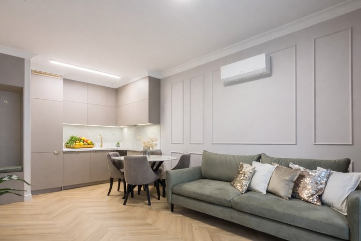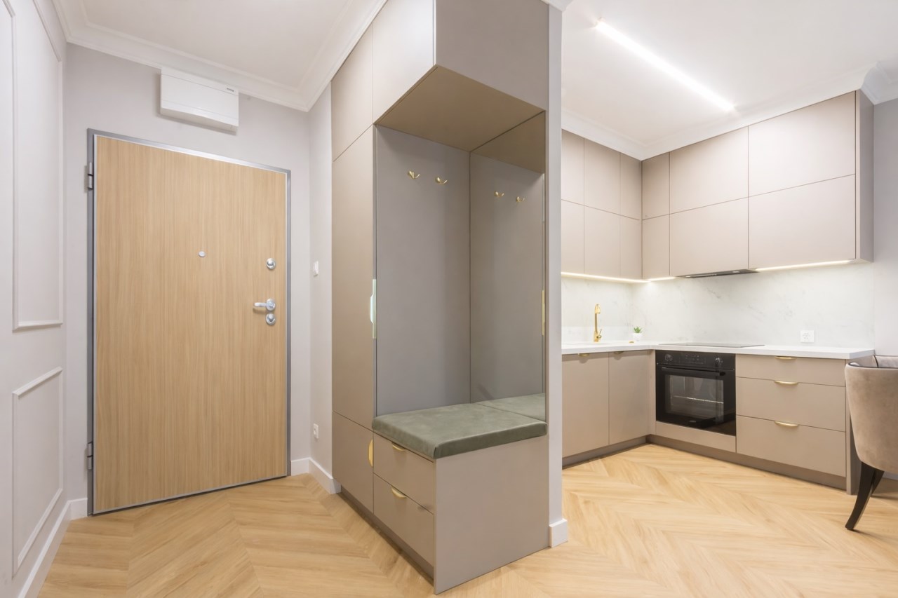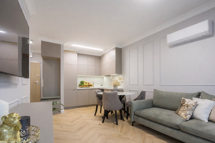 Mieszkanie posiada także pojemne zabudowy i klimatyzację.
