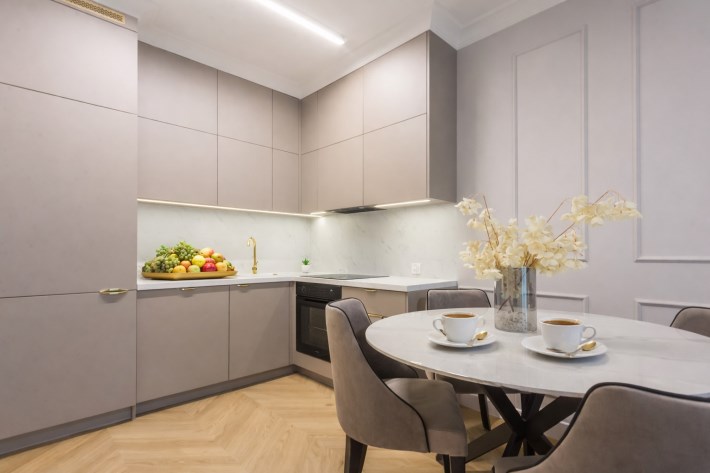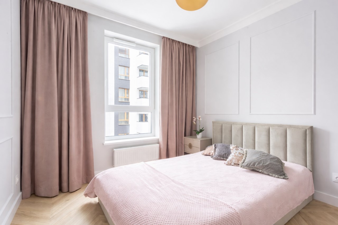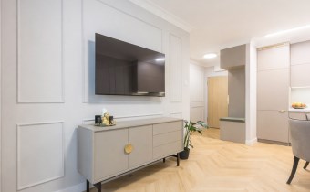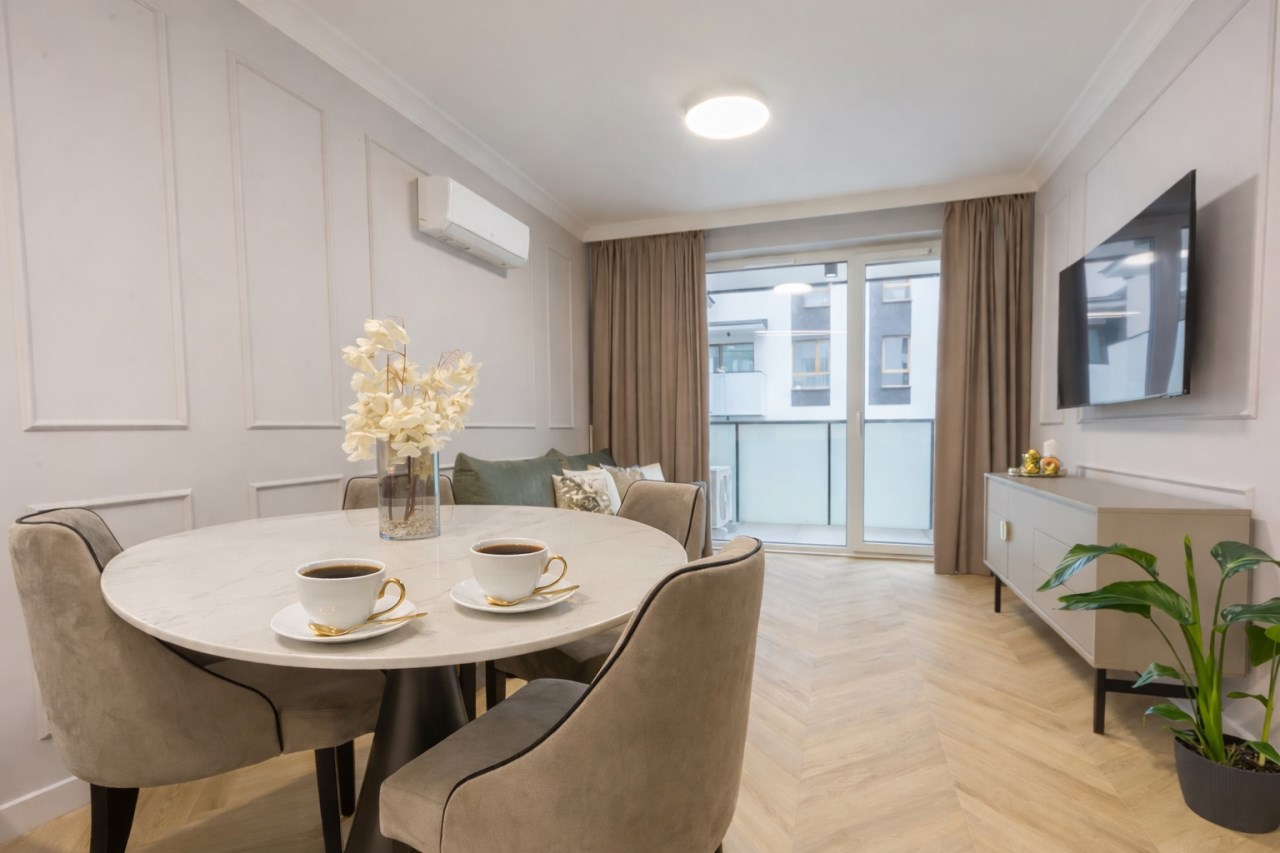 Pastelowe kolory, złote dodatki, solidne, bezprzylgowe, malowane drzwi, wszystko doprecyzowane w każdym calu tworzy spójną całość, w której miło się spędza czas.