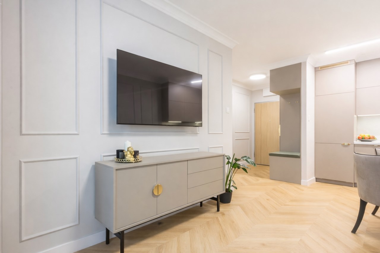 Nieruchomość zdobi piękna, subtelna sztukateria, idealnie zgrana z elegancką podłogą na wzór jodły francuskiej.
