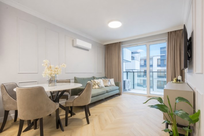 Lokal jest w pełni wyposażony w sprzęt: lodówka, piekarnik, płyta indukcyjna, zmywarka, okap, pralka, telewizor 55 cali oraz meble: stół z krzesłami, rozkładana kanapa i łóżko .