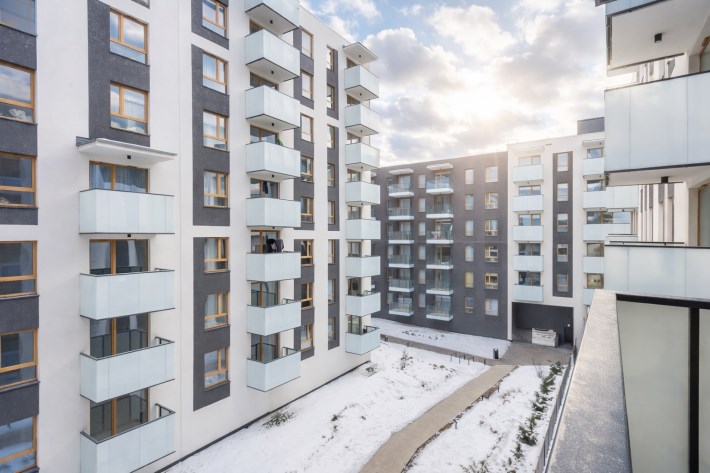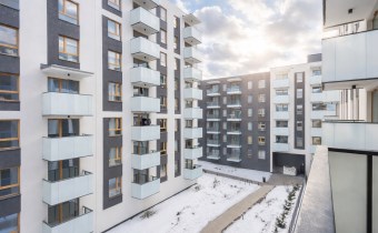 - aneks kuchenny połączony z salonem (19,52 m2) z wyjściem na balkon (3,55 m2) i widokiem na dziedziniec
