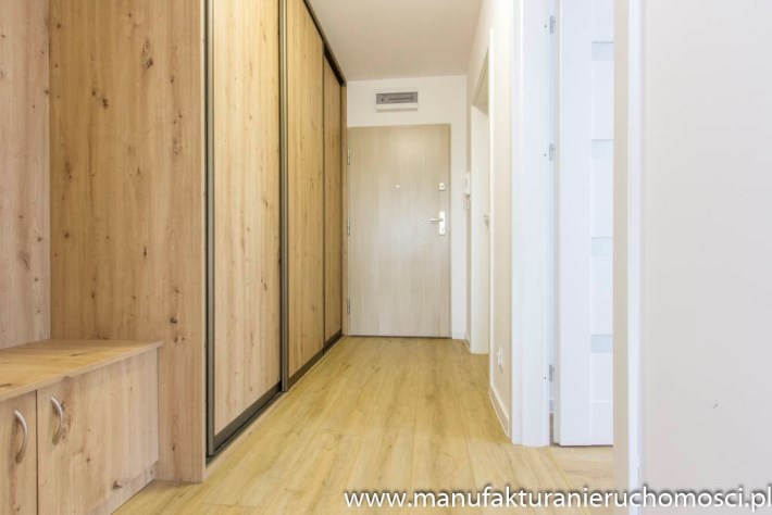 - przedpokój z zabudową stałą wyposażoną w szafki i w pojemne szafy